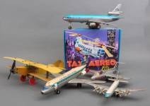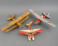 Drie metalen vliegtuigen, uitvoering Meccano, jaren '30 -lichte gebruikssporen, bij de kleinste ontbreekt een moertje-, spanwijdte 45 cm