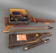 Diverse schietbenodigdheden: twee lederen wapenkoffers, drie richtkijkers, en divers schoonmaakmateriaal -slijtage, enkele delen mogelijk incompleet-
