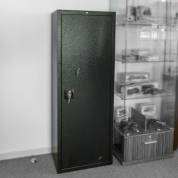 Zwartgroen gelakte metalen wapenkluis, het interieur voorzien van steunen en afsluitbaar vak, model G-3/8, uitvoering NOVCAN, bouwjaar 2010 -lichte gebruikssporen-, 149 × 55 × 35 cm