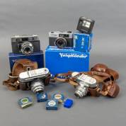 Vier analoge fotocamera's: uitvoering Voigtländer, model Vito CSR, Vito B, Vito CLR en VF135, daarbij enkele accessoires, 20e eeuw -gebruikssporen-, herkomst: Optiek Museum Surhuisterveen
