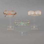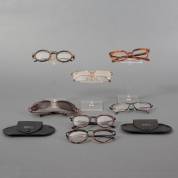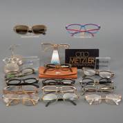 Verzameling brillen en brilmonturen, jaren '60/'70, en drie brillen en één brilmontuur uit de serie 'Mondi', jaren '90, alle gemerkt en uitvoering Metzler, Duitsland, daarbij: merkplaatjes, en twee Metzler beeldjes met opschrift: 'Pruikebril ca. 1750' en 'Face a Main 1880', herkomst: Optiek Museum Surhuisterveen