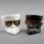 Twee zonnebrillen met vergulde monturen: waarvan één met rood geëmailleerd frame met grijze lijnen, model CN 7, andere model FC 10, beide gemerkt en uitvoering Casanova, Italië -lichte slijtage brilglazen-, daarbij: twee zwart en wit keramische displays in de vorm van een carnavalsmasker, herkomst: Optiek Museum Surhuisterveen
