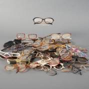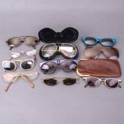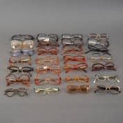 Grote verzameling (zonne)brillen en brilmonturen, diverse uitvoeringen en leeftijden, waaronder: bril met kunststof montuur opgebouwd uit honingkleurig frame met zwarte tempels, model Honig, en bril met donkerrood gemarmerd kunststof montuur, model Sonat, beide gemerkt en uitvoering Paul Grimaud, Duitsland, zwart kunststof bril met hartvormige 'ogen' met opengewerkte verticale banen, niet gemerkt, en bril met koperkleurige tempels en bruin frame, gemerkt en uitvoering Martin Wells, Australië, herkomst: Optiek Museum Surhuisterveen