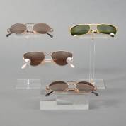 Vier zonnebrillen met vergulde monturen: tweemaal bril met ovale glazen en kleurrijk vlekjesdecor op het frame, model Taxi-2103, bril met 'cat eye' glazen en kruisvormige neusbrug, model Taxi-19, en bril met groene glazen, model Taxi-7, alle vier uit de serie: Taxi Modi di Vedera, uitvoering Casanova, Italië, jaren '90, herkomst: Optiek Museum Surhuisterveen