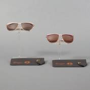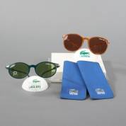 Twee zonnebrillen: één met donkergroen montuur en groene glazen, één met amberkleurig montuur en bruine glazen, beide gemerkt en uitvoering Lacoste, Frankrijk, inclusief twee originele brillenetuis, reclamemateriaal, en twee brillenhouders in de vorm van halve (golf)ballen, herkomst: Optiek Museum Surhuisterveen