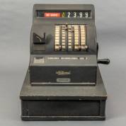 Zwartgelakte metalen kassa, model National, uitvoering N.V. Nationaal Kasregisters v/h Cord H. van Erk, Amsterdam, jaren '40/'50 -gebruikssporen, geldlade opent niet-, 42 × 35 × 42 cm, herkomst: Optiek Museum Surhuisterveen