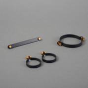 Sieradenset: oorringen, armband, en broche, gematteerd zwart metaal met goudkleurige schroeven, in originele verpakkingsdoos, ontwerp en uitvoering Gail Spence, Denemarken, herkomst: Optiek Museum Surhuisterveen