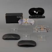 Diverse (zonne)brillen, waaronder: herenbril met verguld montuur, het frame met witgeëmailleerde details, gemerkt en uitvoering Alpina, Duitsland, jaren '80, in originele brillendoos, randloze zonnebril in verguld titanium montuur, gemerkt en uitvoering Kazuo Kawasaki, Japan, en zonnebril met blauw-paars kunststof frame, gemerkt en uitvoering Luciano Soprani, Italië, daarbij: bruin lederen brillenetui met vergulde details, vermoedelijk Hermès, Frankrijk, daarbij: bruin lederen brillenetui, uitvoering Hermes, herkomst: Optiek Museum Surhuisterveen