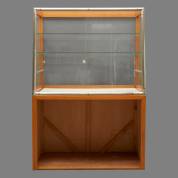 Winkelvitrine, de bovenkast met twee glazen schappen, de onderkast met open vak -gebruikssporen-, 131 × 90 × 50 cm, herkomst: Optiek Museum Surhuisterveen