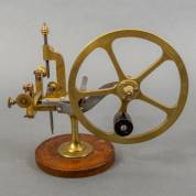 Arrondeermachine op houten voet, circa 1900, 20 × 25 × 17 cm, herkomst: Optiek Museum Surhuisterveen