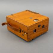Houten 'wet plate' fotocamera, zelfbouw, met aan de binnenzijde enkele houders voor glasplaten, waarvan twee met foto, eind 19e eeuw -gebruikssporen-, herkomst: Optiek Museum Surhuisterveen