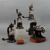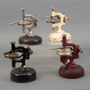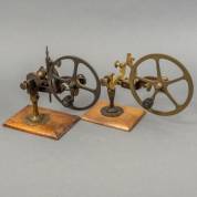 Twee arrondeermachines op houten voeten -enkele onderdelen ontbreken-, afmetingen grootste 18 × 22 × 10 cm, herkomst: Optiek Museum Surhuisterveen