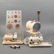 Drie machines van Société de Lunetiers, Frankrijk: twee groefmachines en föhn, afmetingen föhn 29 × 18 × 15 cm, daarbij: display met slijpkoppen, herkomst: Optiek Museum Surhuisterveen
