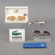 Zonnebril met ronde blauwe glazen, het vergulde montuur met paars-blauw rasterdecor, en zelfde model brilmontuur met blauw rasterdecor, beide jubileumuitgave: gemerkt '1933-1993: 60 Ans - La Chemise Lacoste', en zonnebril met bruine glazen, het vergulde montuur met groengeëmailleerde neusbrug, model 167, alle drie gemerkt en uitvoering Lacoste, Frankrijk, inclusief originele brillendoos en brillenetui, herkomst: Optiek Museum Surhuisterveen