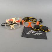 Drie polycarbonaat squashbrillen met kleurrijke stoffen hoofdband -gebruikssporen-, waarvan twee gemerkt 'Liberty', inclusief één Liberty Sports brillenetui -slijtage-, vermoedelijk Amerikaans ontwerp, jaren '70, daarbij: één andere sportbril, en vergelijkbaar brilmontuur, beide van zwart en geel kunststof, herkomst: Optiek Museum Surhuisterveen