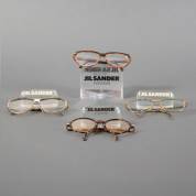 Vier diverse brillen, waaronder twee brillen met vergulde monturen en gedeeltelijk faux parelmoer frames, alle gemerkt en uitvoering Jil Sander, Duitsland, inclusief brillenetui, dustbag, en diverse plexiglazen merkplaatjes, herkomst: Optiek Museum Surhuisterveen