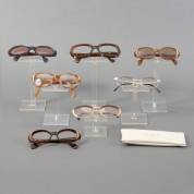 Zeven (zonne)brillen en brilmonturen, alle gemerkt en uitvoering Serge Kirchhofer, Duitsland: zonnebril met paars kunststof montuur en paarse glazen, zonnebril en vergelijkbaar brilmontuur, respectievelijk met zilverkleurige en goudkleurige vlekjes in het frame, zilverkleurig metalen brilmontuur, ingelegd met gefacetteerde paarse steentjes, etc., inclusief één brillenetui, herkomst: Optiek Museum Surhuisterveen