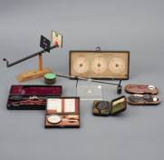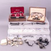 Tweemaal 'Grolman Fitting System': optisch meetinstrument voor het aanmeten van progressieve lenzen, gemerkt en uitvoering American Optical, beide in originele doos, eenmaal 'Univis Multimezur': pupildistantie- en lensgrootte meter, uitvoering The Univis Lens Company, Ohio, en andere optische meetinstrumenten, daarbij: Silhouette brillenpas-set, in kunststof ladekastje -incompleet-, herkomst: Optiek Museum Surhuisterveen