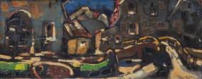 Nicolaas Petrus Quirinus 'Nico' van Rijn (1887-1962), stadsgezicht, olieverf op board, r.o. gesigneerd, 21 × 52 cm, draagt verso collectielabel van Sal Slijper en bruikleenlabel van het Singer Museum in Laren