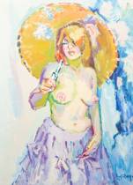 Freek van den Berg (1918-2000), vrouw met ontbloot bovenlichaam en parasol, olieverf op doek, r.o. gesigneerd, 109 × 87 cm