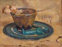 Mogelijk Marie van Regteren Altena (1868-1958), stilleven met gedroogde papavers, kom en Egyptische ushabti, marouflé, niet gesigneerd, 23 × 30,5 cm