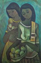 Roger San Miguel (1940), twee fruitverkoopsters, olieverf op doek, l.o. gesigneerd, 76 × 61 cm