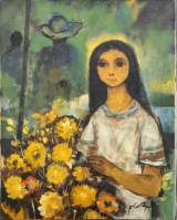 Roger San Miguel (1940), meisje met bloemen, olieverf op doek, r.o. gesigneerd, 76 × 61 cm