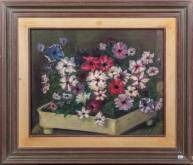Schilderij: petunia's in bak, olieverf op doek, niet gesigneerd, 40,5 × 51 cm