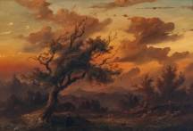 Johannes Tavenraat (1809-1881), landschap bij ondergaande zon met wandelaar bij boom en rustende schaapsherder, olieverf op paneel, l.o. gesigneerd en gedateerd '48, 27 × 39 cm