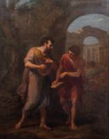 Italiaanse School: twee discussiërende mannen in toga bij ruïne, olieverf op doek, niet gesigneerd, 18e eeuw -gedoubleerd-, 91,5 × 72 cm