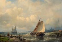 Nicolaas Riegen (1827-1889), uitvarende zeilboot bij stevige wind, met een stad in het verschiet, olieverf op doek, l.o. gesigneerd en gedateerd '56 -gedoubleerd-, 37 × 55 cm