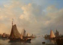 Frans Jacobus van den Blijk (1806-1876), schepen op de rivier bij kalm weer, olieverf op paneel, r.o. gesigneerd, 58 × 79,5 cm
