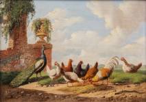 Albertus Verhoesen (1806-1881), pluimvee, waaronder pauw, bij ruïne, olieverf op paneel, l.o. gesigneerd en gedateerd 1871, 17 × 24,5 cm
