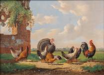 Albertus Verhoesen (1806-1881), pluimvee, waaronder kalkoen, bij ruïne, olieverf op paneel, l.o. gesigneerd en gedateerd 1871, 18 × 24,5 cm