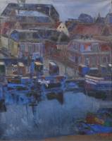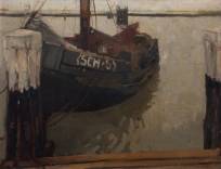 Toon Kelder (1894-1973), stadsgezicht met boten aan de kade, olieverf op doek, l.o. gesigneerd en gedateerd '25 -gat in doek l.o., vele kleine lacunes-, 98 × 81 cm