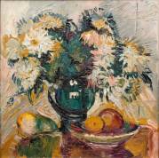 George Martens (1894-1979), stilleven van bloemen in een groene vaas met fruit ernaast, olieverf op doek, l.o. gesigneerd en gedateerd 1931 -gerestaureerd in 1987/'88 door Thijs Martens, volgrecht van toepassing-, 50,5 × 50,5 cm, daarbij: twee kopieën van brieven van Thijs Martens (zoon van de kunstenaar), de eerste uit 6-12-'87 waarin hij schrijft over de restauratie van het werk, de tweede uit 16-12-'92, waarin hij schrijft een voorstudie van het werk gevonden te hebben, kopie van de studie bijgevoegd