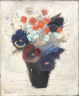 Jacobus Jan Koeman (1889-1978), bloemstilleven met viooltjes in zwarte vaas, olieverf op doek, l.o. gesigneerd en gedateerd 1968, 30 × 25 cm