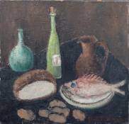 Hubert-Henri de Vries (1899-1979), stilleven met flessen, brood en vis, olieverf op doek, r.o. gesigneerd, 70 × 73 cm