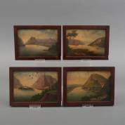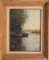 Vier schilderijtjes: rivierlandschappen, olieverf op papier, niet gesigneerd, 19e eeuw -één met verfverlies, alle met craquelé en vlekjes-, 12 × Ø 16,5 cm