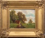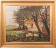 Schilderij: zicht op boerenerf met poort, olieverf op doek, r.o. gesigneerd H.J. Keamerling, vermoedelijk België, begin 20e eeuw, 39 × 56 cm