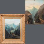 Duitse School: twee berglandschappen met figuren, olieverf op schilderskarton, beide gemonogrammeerd AC en gedateerd 1878, één in verguld- en bladzilveren pâte lijst -allebei met punaisegaten-, 35 × 27 cm