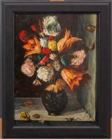 Hollandse School: bloemstilleven, geïnspireerd door Ambrosius Bosschaert, olieverf op board, r.o. gemonogrammeerd P.v.A., modern, 39 × 29 cm