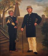 Indonesische School: portret van witte man met baard en uniform, en een Indonesische secondant, olieverf op doek, r.o. gesigneerd R. Soepangat, modern, 74 × 64 cm