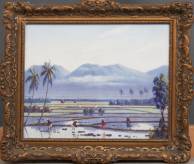 Schilderij: arbeiders in de rijstvelden, marouflé, niet gesigneerd, 23 × 29 cm
