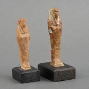 Twee ushabti, Egypte, beide op houten voet, -één gelijmd-, maat grootste exclusief voet 12,4 cm