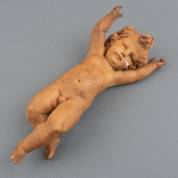 Gesneden lindenhouten cherubijntje, 18e eeuw -defecten aan ledematen, opgevuld gaatje, sporen oude houtworm-, 40 cm