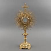 Messing monstrans met opengewerkt decor van druivenranken, bezet met geslepen helder glazen stenen, de stam met rode stenen, 20e eeuw, 55 × 28 × Ø 19 cm