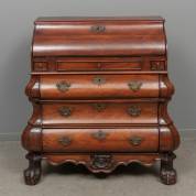 Hardhouten secretaire met achter de klep diverse vakken en laatjes, de dubbelgebogen onderkast met drie kleine laatjes waaronder drie grote lades en portretmedaillon, staand op bolklauwpoten, 18e eeuw -gebruikssporen en poten verhoogd-, 108 × 103 × 50 cm