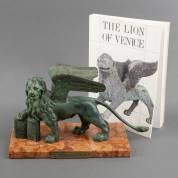 Bronzen beeld: de Venetiaanse Leeuw van Sint Marcus, gepatineerd brons op marmeren basement, met plaquette 'Il Sindacodi Venezia', eind 20e eeuw, 21 × 16 × 37,5 cm, daarbij: boek, 'The Lion of Venice'