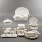 Beenderporseleinen serviesgedeelte, decor Cavendish, uitvoering Wedgwood, bestaande uit: vier dinerborden Ø 27 cm, zeven borden Ø 23 cm -gebruikssporen: krassen-, negen taartbordjes Ø 17,5 cm, tien broodbordjes Ø 15 cm, zeven diepe borden Ø 23 cm, vier kommen Ø 15 cm, acht koffiekop-en-schotels, twee theekop-en-schotels, roomstel, zes eierdoppen en divers dienservies